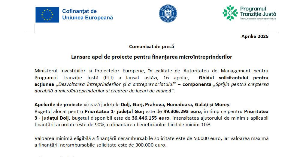 Ministerul Investițiilor și Proiectelor Europene, în calitate de Autoritatea de Management pentru Programul Tranziție Justă (PTJ) a lansat astăzi, 16 aprilie, Ghidul solicitantului pentru acțiunea „Dezvoltarea întreprinderilor și a antreprenoriatului” – componenta „Sprijin pentru creșterea durabilă a microîntreprinderilor și crearea de locuri de muncă”.