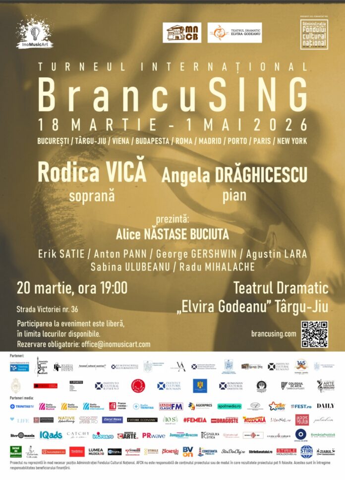Turneul internațional BrancuSING ajunge la Târgu Jiu vineri, 20 martie, cu un concert-eveniment dedicat aniversării a 150 de ani de la nașterea marelui sculptor Constantin Brâncuși. Este un proiect artistic ce reunește muzica, patrimoniul și creația contemporană.
