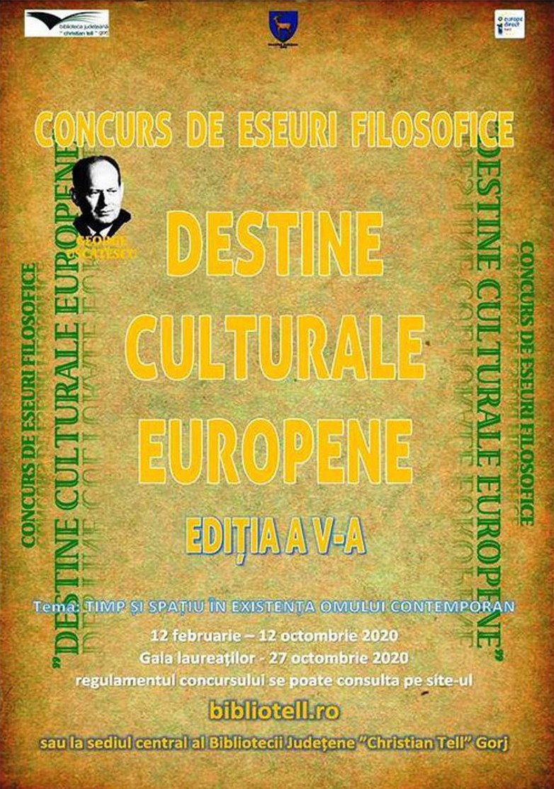 Elevii de liceu din Gorj sunt invitați să se înscrie la ediția 2020 a concursului de eseuri filosofice ,,Destine culturale europene”, organizat de Biblioteca Județeană ,,Christian Tell” și Centrul de Informare Europe Direct Gorj. Termenul limită pentru trimiterea lucrărilor este 12 octombrie, iar câștigătorii vor fi premiați pe 27 octombrie.