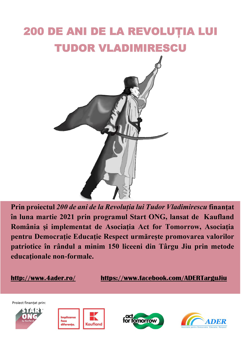 Asociația pentru Democrație Educație Respect implementează proiectul ,,200 de ani de la Revoluția lui Tudor Vladimirescu”, finanțat prin programul Start ONG, lansat de Kaufland Romania și implementat de Asociația Act for Tomorrow.