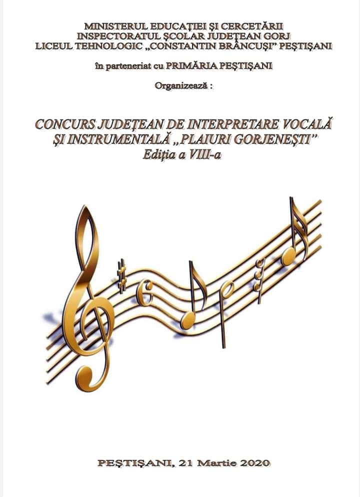 Cea de-a opta ediţie a Concursului Judeţean de Interpretare Vocală şi Instrumentală “Plaiuri Gorjeneşti” va avea loc în pe 21 martie, la Peştişani. Manifestarea este organizată de către Inspectoratul Şcolar Judeţean Gorj, Liceul Tehnologic “Constantin Brâncuşi” Peştişani, în colaborare cu Primăria Peştişani.