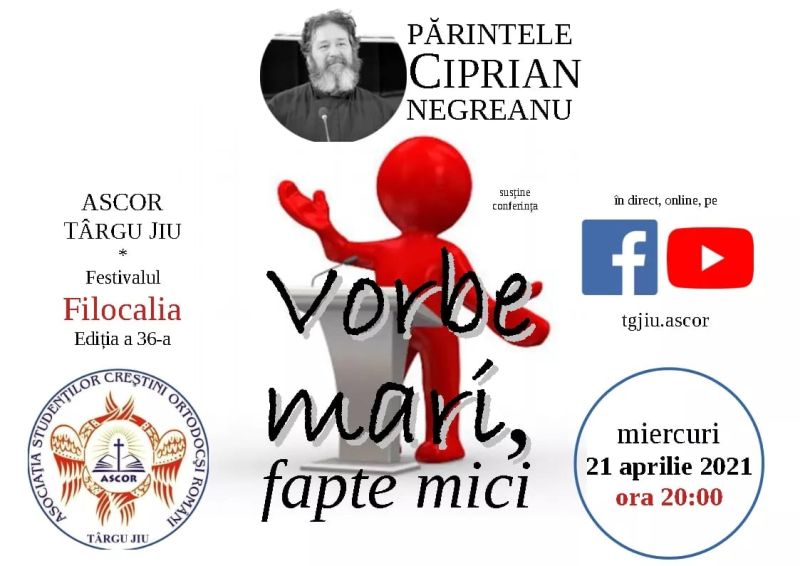 Asociaţia Studenţilor Creştin – Ortodocşi Români (ASCOR), filiala „Sfântul Irodion de la Lainici” Târgu Jiu, organizează în Postul Sfintelor Paşti, în perioada 21 – 27 aprilie, seria de conferinţe religioase „Filocalia”, editia a 36-a. Evenimentul se desfăşoară cu binecuvântarea Înaltpreasfinţitului Părinte Irineu, Arhiepiscopul Craiovei şi Mitropolitul Olteniei. Prima conferinţă a avut loc în sistem online, miercuri, 21 aprilie, începând cu ora 20.00; Pr….