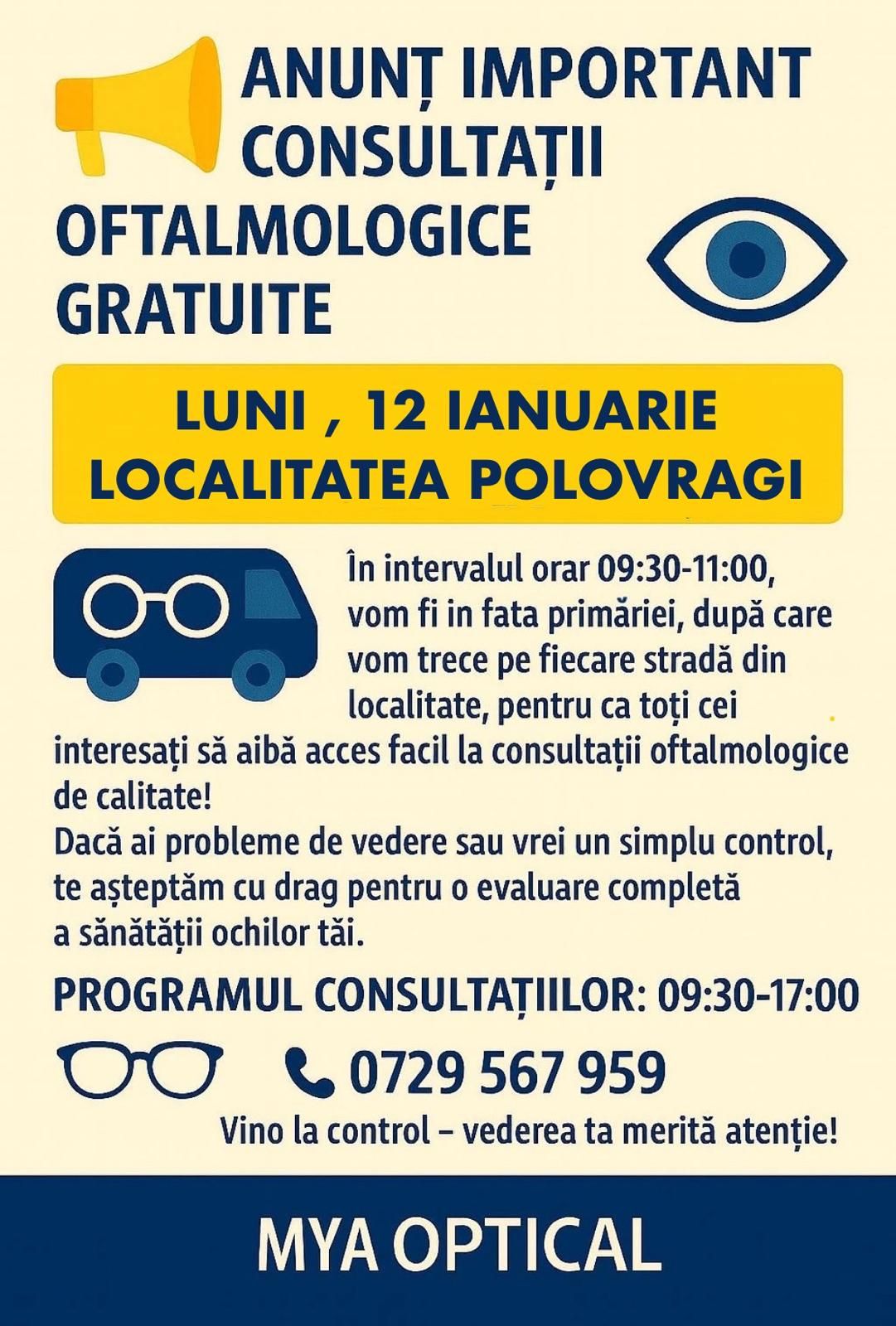 Locuitorii comunei Polovragi vor beneficia, luni, de consultații oftalmologice gratuite.