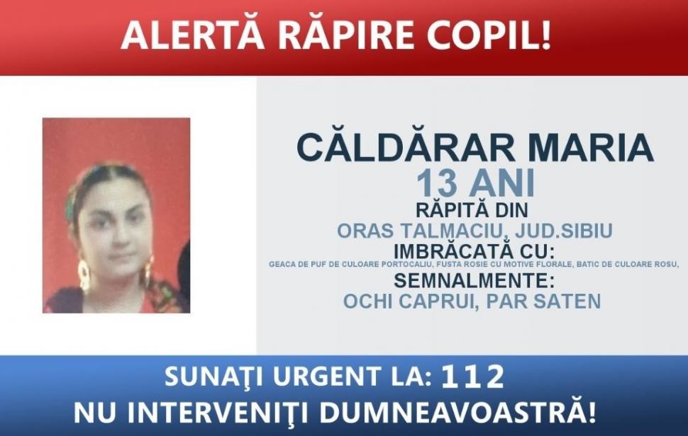 Poliția a anunțat răpirea unei adolescente de 13 ani pe nume Maria Căldărar și face apel la populație pentru găsirea ei.