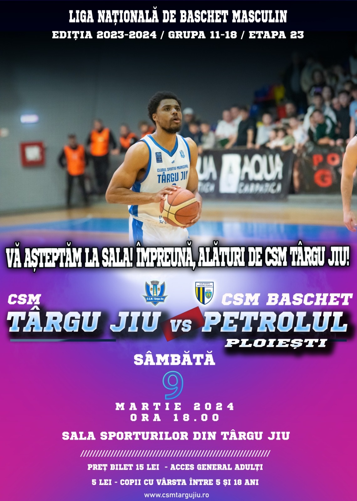CSM Târgu Jiu întâlnește, sâmbătă, CSM Baschet Petrolul Ploiești, în etapa a 23-a din Liga Națională de Baschet Masculin Getica 95. Baschetbaliștii lui Kresimir Basic intră în luptă cu gândul la victorie, pentru o clasare cât mai bună în Grupa 11-18.