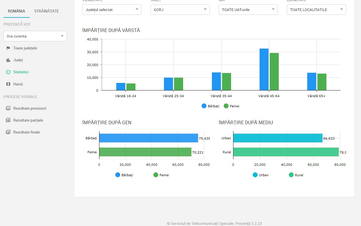 Peste 145.000 de gorjeni au mers la urne, respectiv 48,70% dintre cei cu drept de vot. Cea mai slabă prezență la vot vine din partea tinerilor.