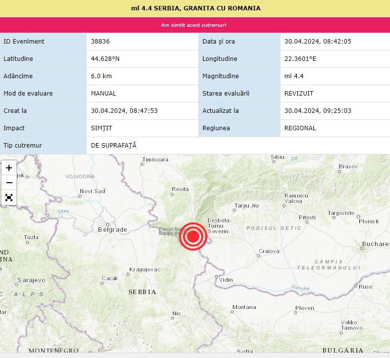 Un cutremur cu magnitudinea 4,4 s-a produs marţi dimineaţa, la ora locală 8:42, în Serbia, la graniţa cu România. Informațiile au fost publicate de Institutul Naţional de Cercetare-Dezvoltare pentru Fizica Pământului (INCDFP).