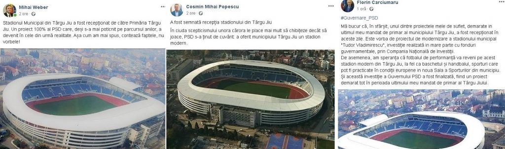 Liderii PSD Gorj se laudă, pe paginile de socializare, cu finalizarea noului stadion din Târgu-Jiu. Mihai Weber, Florin Cârciumaru și Cosmin Popescu au postat, marți dimineață, mesaje similare în care precizează că investiția se datorează guvernului PSD.