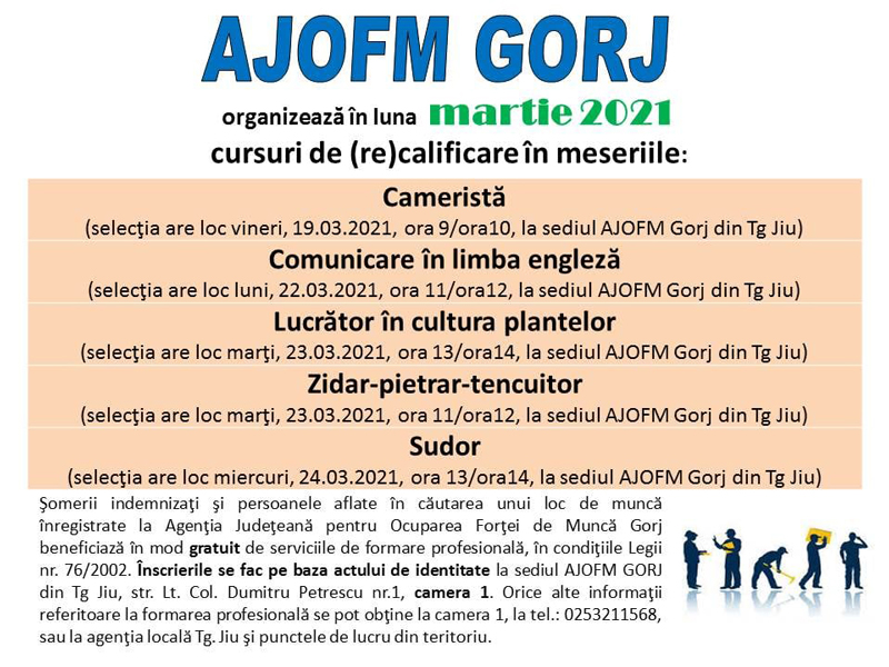 Agenția Județeană pentru Ocuparea Forței de Muncă (AJOFM) Gorj demarează de mâine, 19 martie, selecția persoanelor care doresc să participe la cursurile de recalificare profesională organizate de instituție în perioada imediat următoare. Astfel, selecția pentru cursul de cameristă va avea loc mâine, la sediul din Târgu-Jiu al instituției județene, fiind urmată, în data de 22 martie 2021, de selecția pentru cursul de comunicare în limba engleză, dar și de: 23 martie…