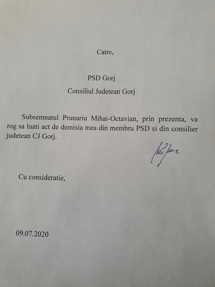 Fostul vicepreședinte al PSD Gorj, Mihai Prunariu, a anunțat că își dă demisia din Consiliul Județean Gorj. El a postat pe facebook o adresă înaintată către PSD și Consiliul Județean Gorj în care își anunță demisia „din membru PSD și consilier județean”.