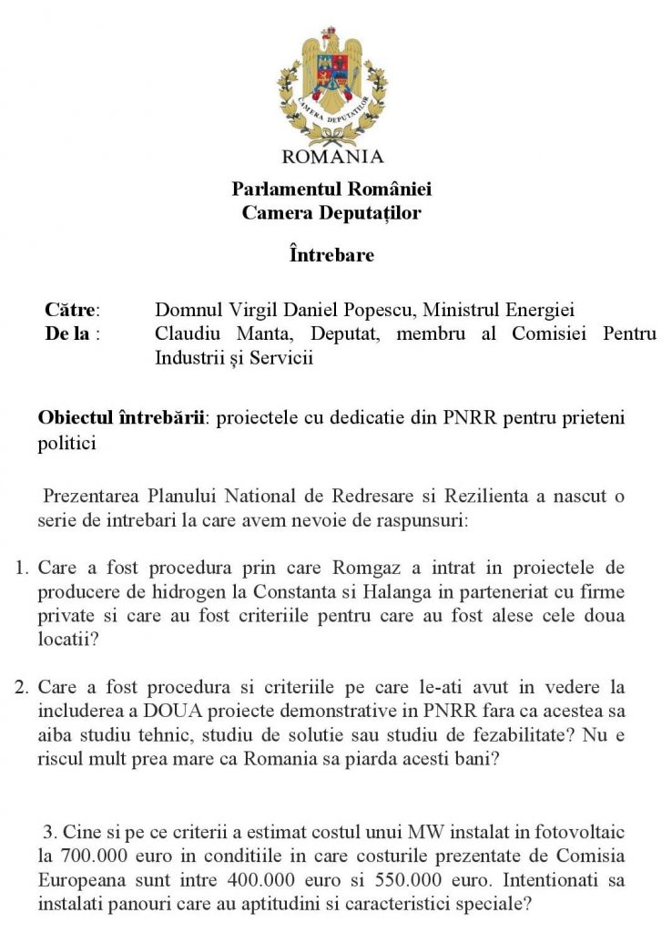 Deputatul PSD Gorj, Claudiu Manta, i-a scris ministrului Energiei, Virgil Popescu, în legătură cu Planul Național pentru Redresare și Reziliență. „Întocmirea PNRR pe baza unor proiecte dedicate prietenilor politici a născut o serie de întrebări la care aștept răspuns. Nu pot accepta neglijența cu care a fost tratat Complexul Energetic Oltenia, o unitate condamnată la închidere într-un viitor mult prea apropiat”, a transmis parlamentarul.