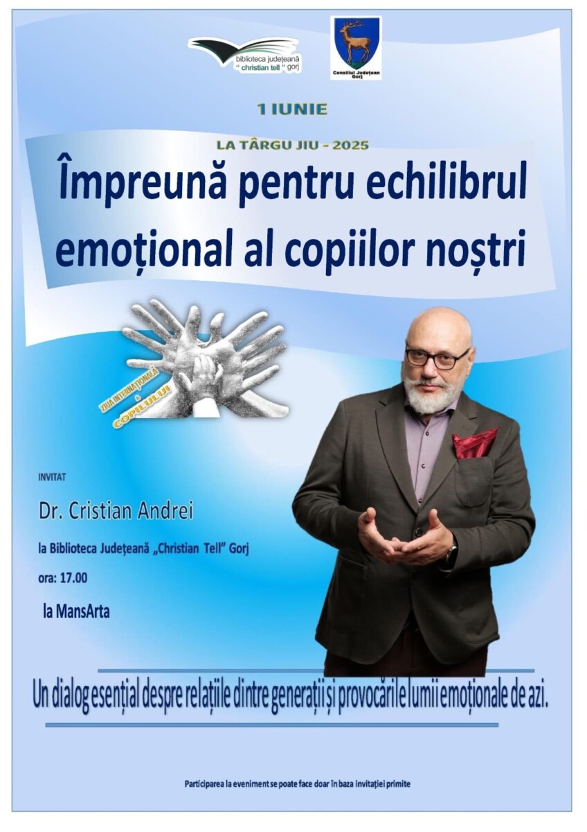 Consiliul Județean Gorj organizează pe 1 iunie, de Ziua Internațională a Copilului, un eveniment dedicat relațiilor dintre generații și echilibrului interior. În cadrul întâlnirii, medicul și psihoterapeutul Dr. Cristian Andrei va aborda teme importante despre comunicarea între copii, adolescenți și adulți, precum și despre gestionarea stresului și dinamica familială.