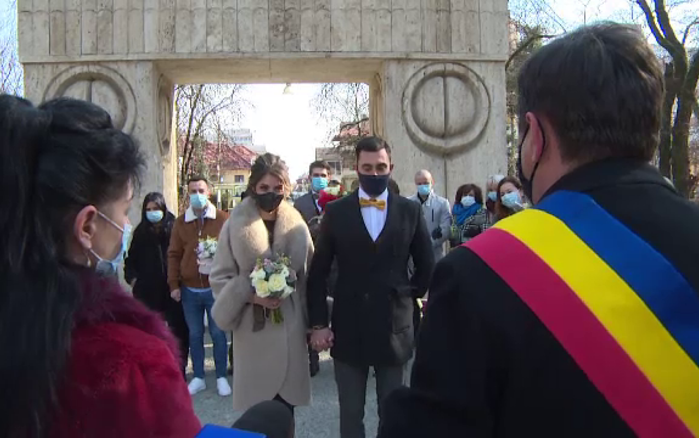 Duminică, de Valentine’s Day, doi tineri îndrăgostiți și-au unit destinele la Poarta Sărutului, în Târgu Jiu.