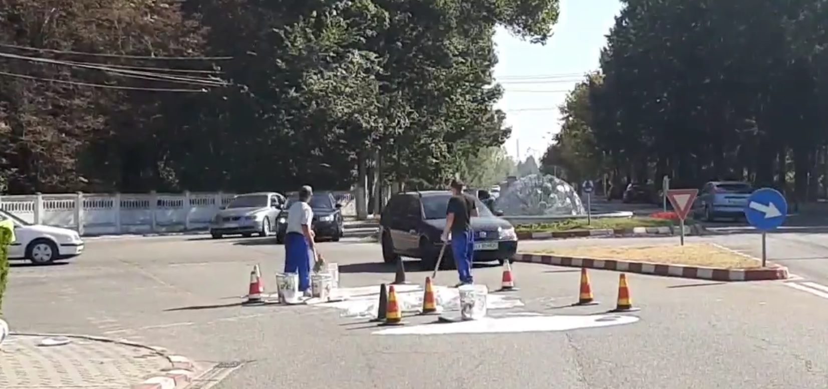 Circulația s-a desfășurat cu greutate în intersecția cu sens giratoriu, pentru că șoferii au circulat pe o singură bandă, deoarece una era ocupată de lucrătorii care încercau să curețe vopseaua întinsă pe partea carosabilă.