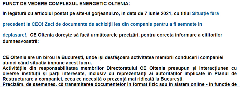 În legătură cu articolul postat pe site-ul gorjeanul.ro, în data de 7 iunie 2021, cu titlul Situaţie fără precedent la CEO! Zeci de documente de achiziții ies din companie pentru a fi semnate în deplasare!, CE Oltenia dorește să facă următoarele precizări, pentru corecta informare a cititorilor dumneavoastră: