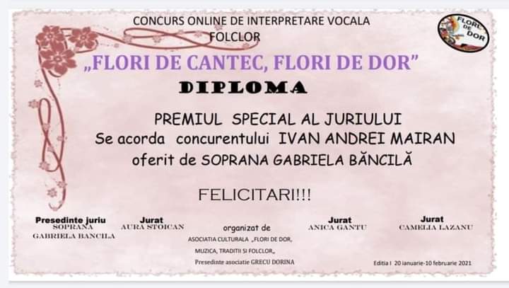 În urma participării la festivalul-concurs „Flori de cântec, flori de dor”, Andrei Marian Ivan, cursant în anul I de perfecționare la Școală Populară de Arte “Constantin Brâncuși” Târgu Jiu, a obținut Premiul Special al juriului. “Festivalul-concurs „Flori de cântec, flori de dor” este o competitie muzicală adresată copiilor pasionați de folclor, profesioniști și amatori, o competiție bazată pe valori morale, corectitudine și respect pentru munca depusă de…