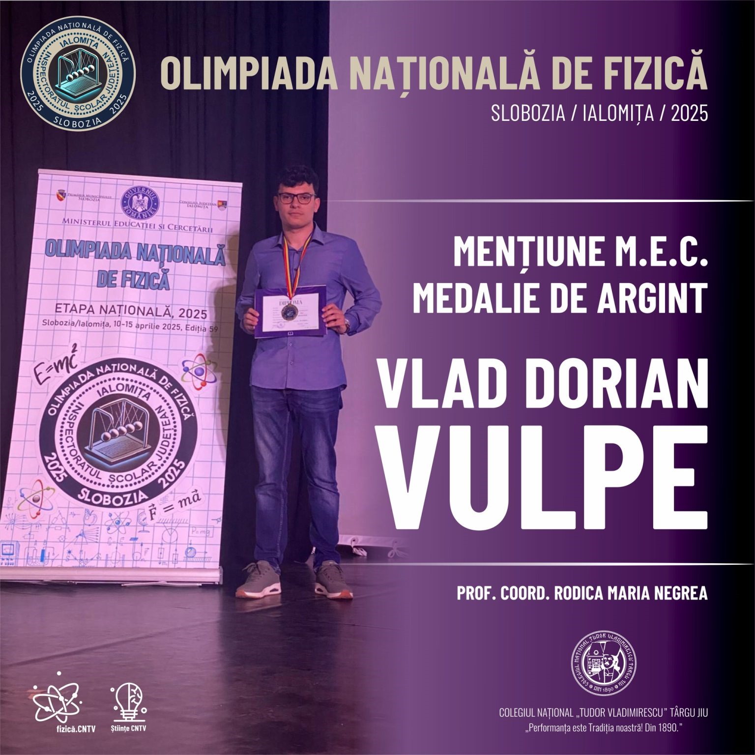 Vlad Dorian Vulpe, elev în clasa a XI-a la Colegiul Național „Tudor Vladimirescu” din Târgu Jiu, a obținut medalia de argint și o mențiune din partea Ministerului Educației la etapa națională a Olimpiadei de Fizică. Performanța sa i-a adus și calificarea în lotul lărgit al României, din care vor fi selectați reprezentanții pentru etapa internațională.
