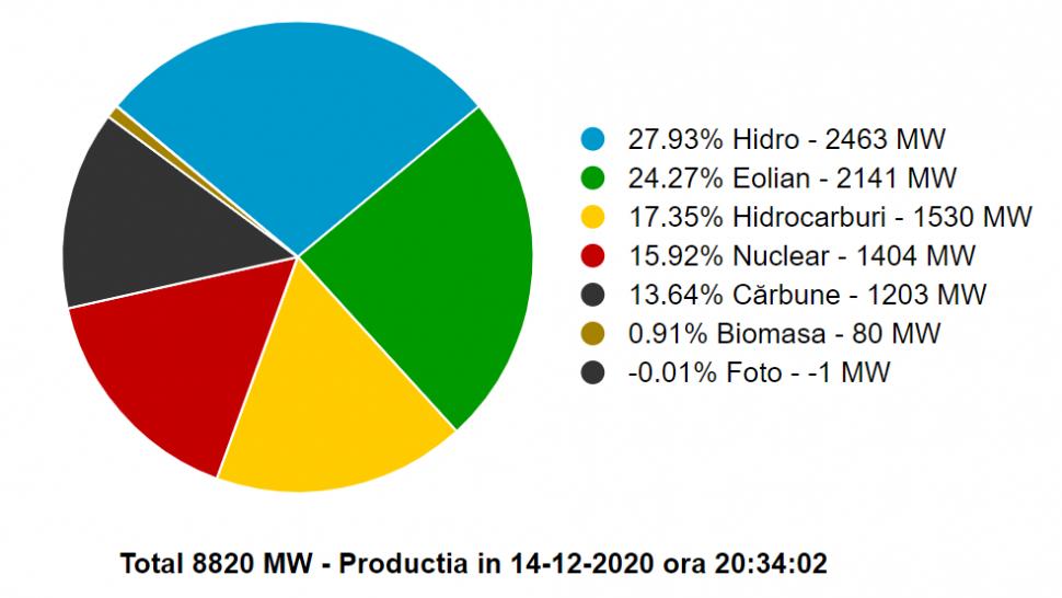 Circa 50 – 60% din producţia totală de electricitate a ţării a provenit luni din surse regenerabile, în special hidro şi eolian, potrivit situaţiei privind starea sistemului energetic naţional, prezentată în timp real pe site-ul Transelectrica.