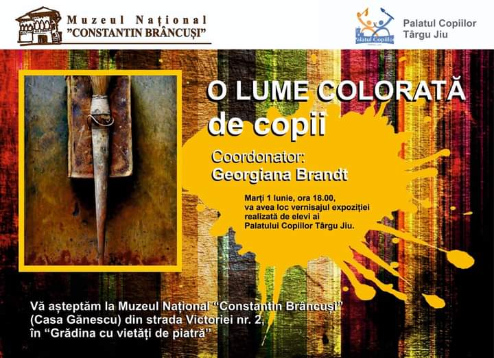 Marți, 1 iunie, la ora 18.00, la Muzeul Național “Constantin Brâncuși” va avea loc vernisajul expoziției “O LUME COLORATĂ de copii”. Vor fi expuse peste 30 de lucrări de pictură de șevalet aparținând elevilor de la Palatul Copiilor din Tg-Jiu, coordonați de prof. Georgiana Brandt, artist plastic.