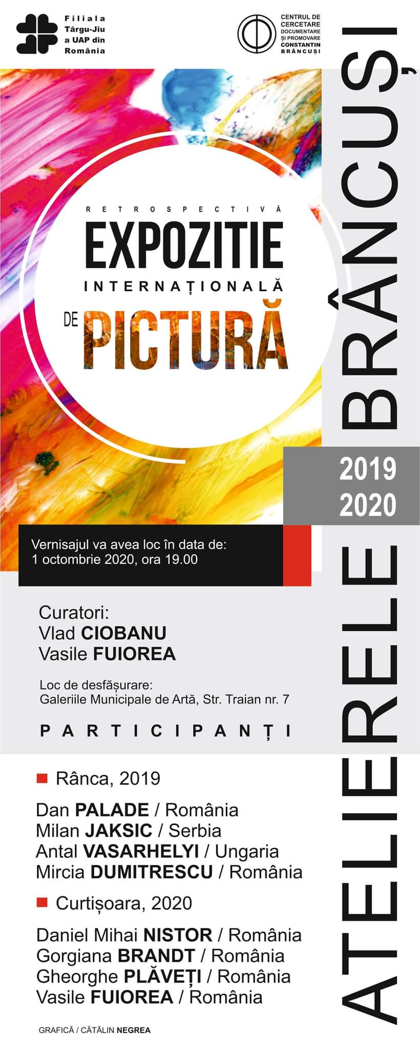 Centrul de Cercetare Documentare și Promovare “Constantin Brâncuși”, în parteneriat cu Filiala Târgu Jiu a UAP din România, organizează joi, 1 octombrie, ora 19.00, la Galeriile Municipale de Artă din Târgu-Jiu, Expoziția Retrospectiva de Pictură “Atelierele Brâncuși”, Ediția 2019, Rânca și Ediția 2020, Curtișoara. Curatori: Vlad Ciobanu, Vasile Fuiorea.