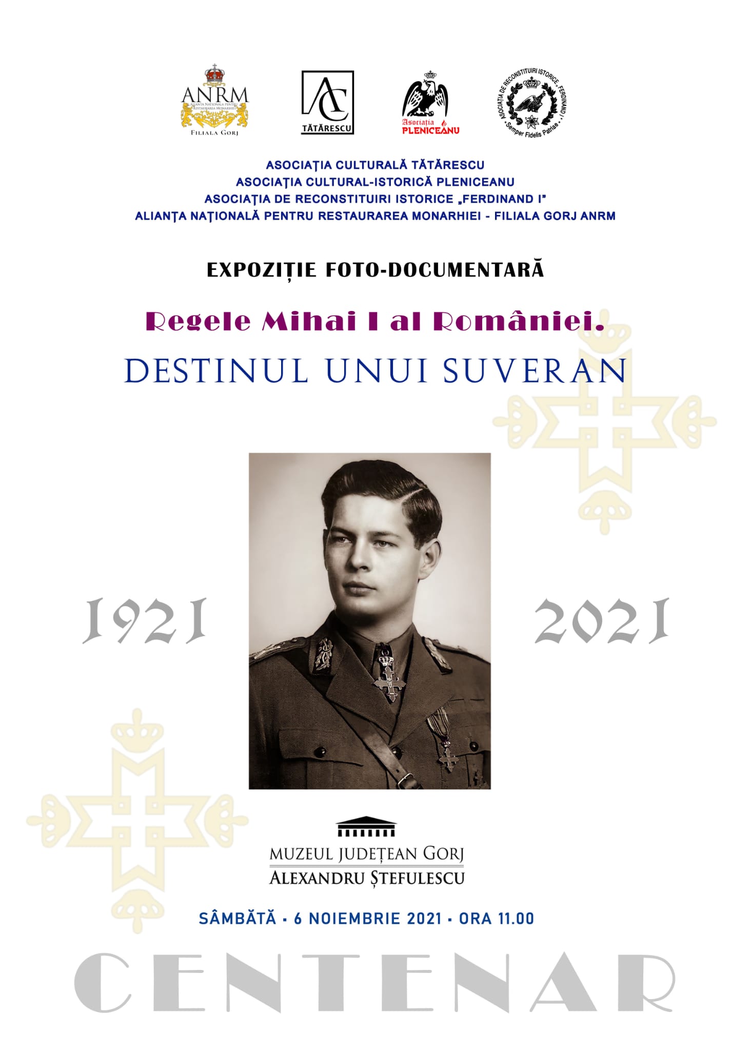 Asociația culturală „Tătărescu”, Asociația cultural-istorică Pleniceanu, Asociația de Reconstituiri Istorice „Ferdinand I” și Alianța Națională pentru Restaurarea Monarhiei – Filiala Gorj ANMR, organizează la Muzeul Județean Gorj „Alexandru Ștefulescu”, în data de 6 noiembrie, cu ocazia aniversării…