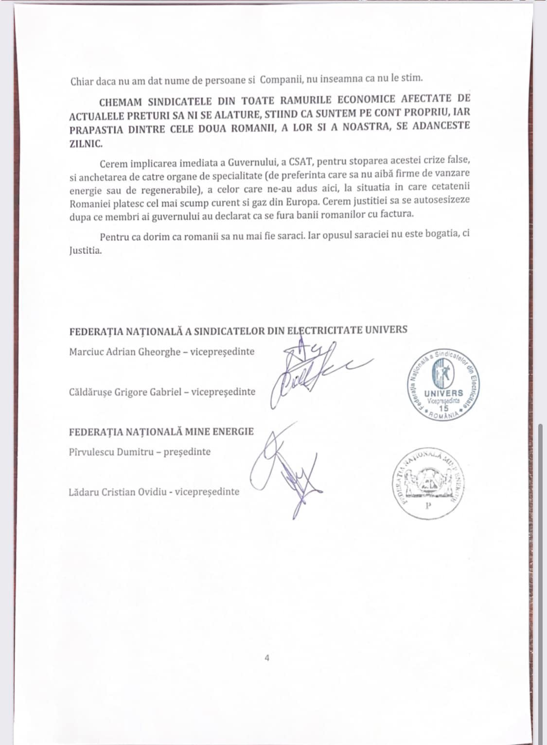 Federația Națională a Sindicatelor din Electricitate – Univers și Federația Națională Mine Energie transmit președintelui Iohannisâ, Guvernului, Parlamentului și Ministerului, o Scrisoare Deschisă, cerând explicații pentru facturile uriașe la energie. Tot documentul, în integralitate, mai jos: