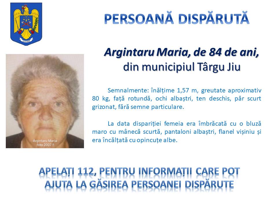 O femeie de 84 de ani a fost dată dispărută de către familia din Târgu Jiu. Polițiști din cadrul Poliției Municipiului Târgu Jiu au fost sesizați ieri prin apelul 112 de o femeie de 61 de ani, din comuna Mârșani, județul Dolj, despre faptul că, mama sa Argintaru Maria, de 84 de ani, a plecat de la locuința apelantei situată în municipiul Târgu Jiu și nu a mai revenit.