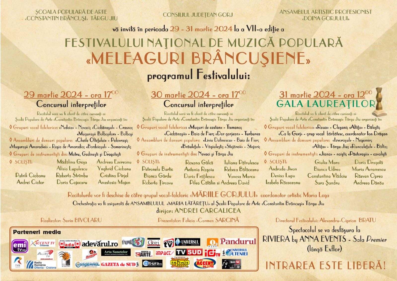 În perioada 29 – 31 martie se va desfășura cea de-a VII-a ediție a Festivalului Național de Muzică Populară „Meleaguri Brâncușiene”.Evenimentul este organizat de către Școala Populară de Arte ”Constatin Brâncuși” Târgu Jiu, alături de Consiliul Județean Gorj și Ansamblul Profesionist “Doina Gorjului”, în colaborare cu posturi de radio și televiziuni locale și naționale. Acest festival-concurs îşi propune să încurajeze şi să contribuie la descoperirea…