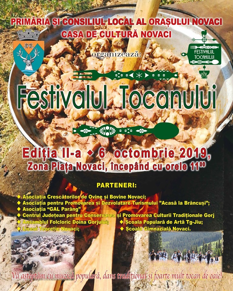 Primăria și Consiliul Local al orașului Novaci și Casa de cultură Novaci organizează în data de 6 octombrie 2019 a doua ediție a Festivalului ”Tocanul de Novaci”. În această zi locuitorii orașului Novaci, cât și turiștii, vor putea vedea spectacolul susținut de Ansamblul Folcloric ”Nedeia” al Casei de Cultură Novaci și cel mai important să guste din gustosul și tradiționalul tocan de oaie.