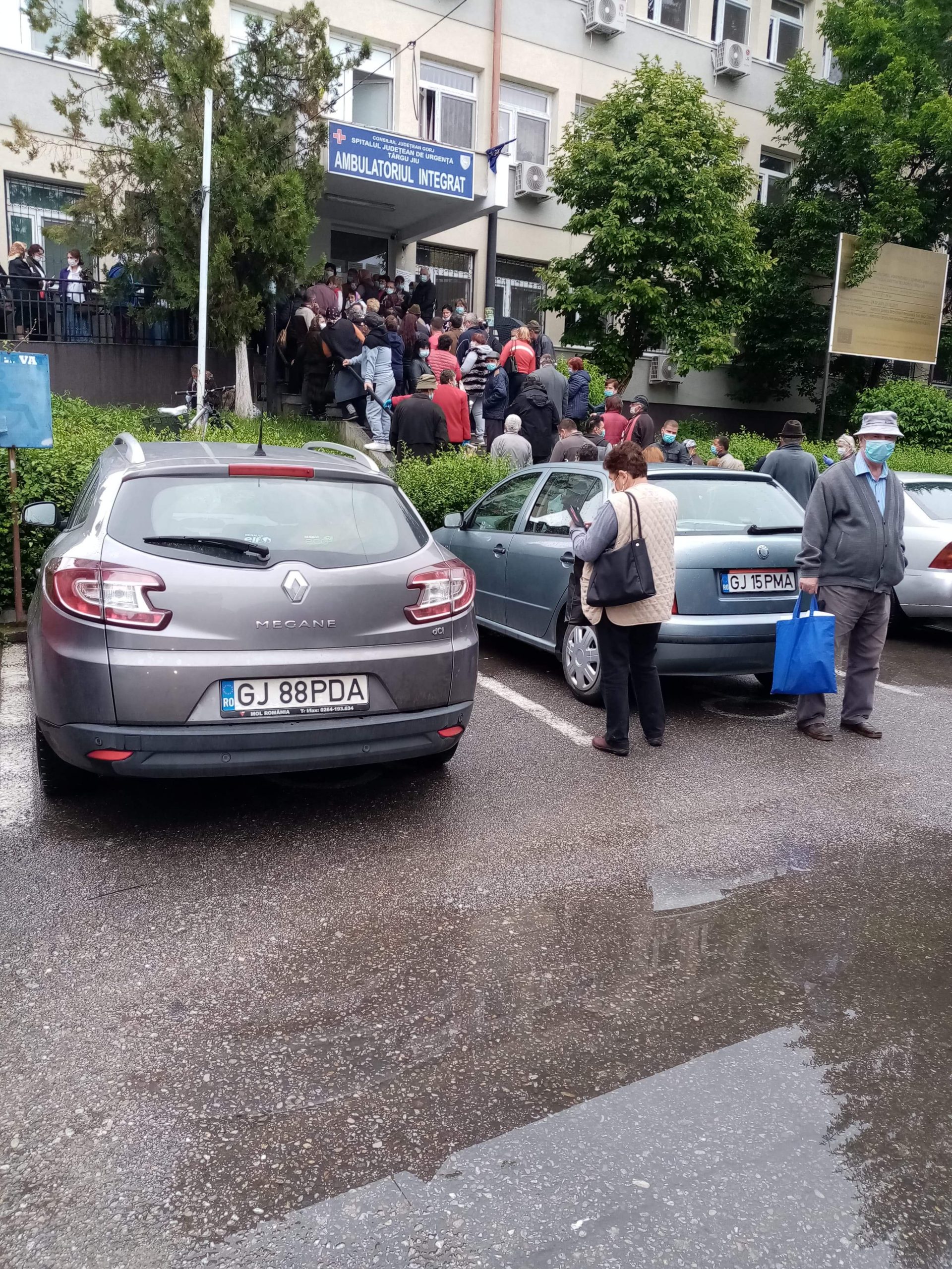 Zeci de persoane stau la coadă în fața Policlinicii Târgu-Jiu, îngrămădiți pe scările de la întrare și pe părțile laterale, coada de oameni ajungând până în stradă.