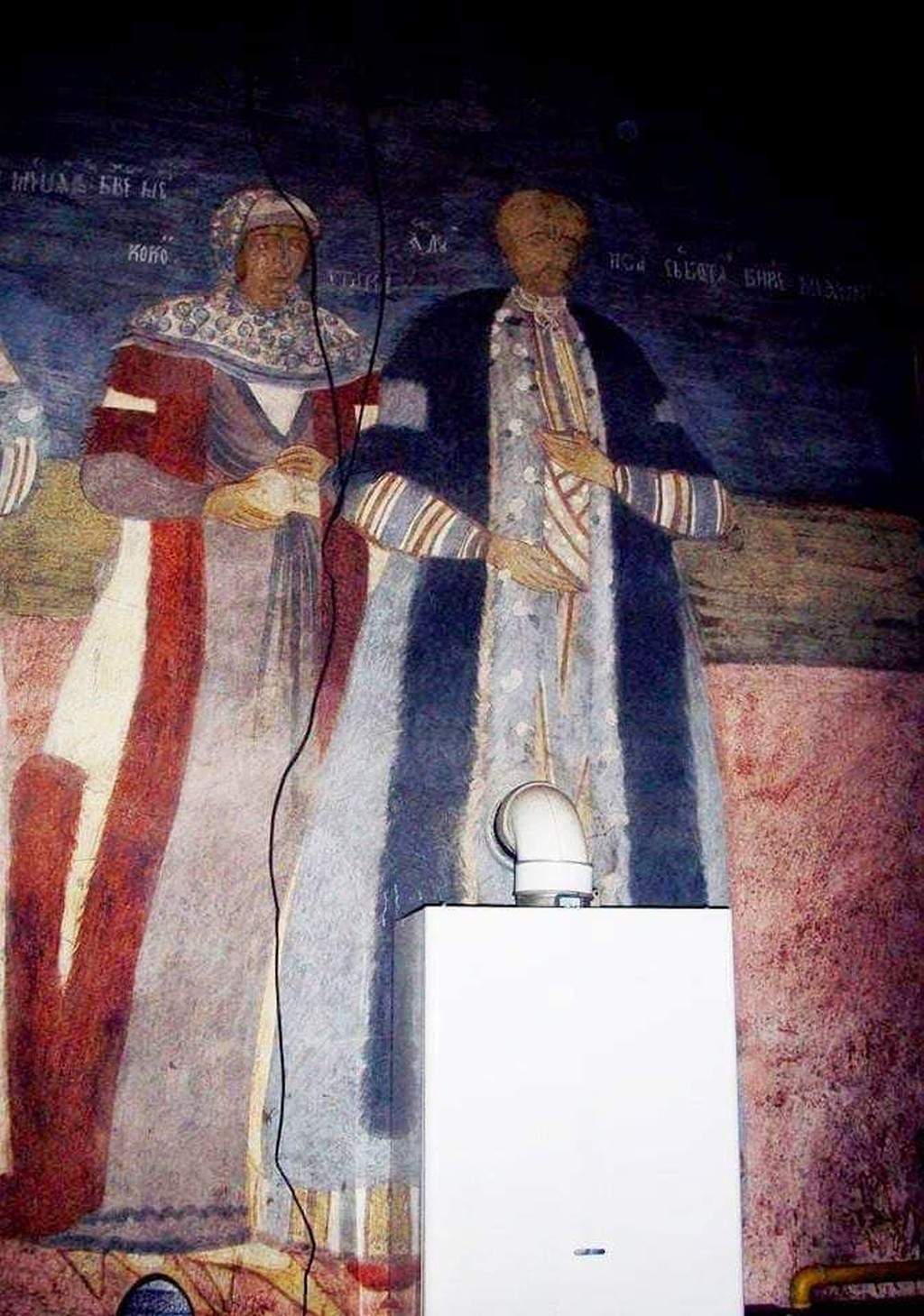 O pictură din biserica Sfântul Nicolae din Târgu Jiu, edificiu ortodox vechi de peste 200 de ani, a fost distrusă de un instalator care a montat o centrală termică.