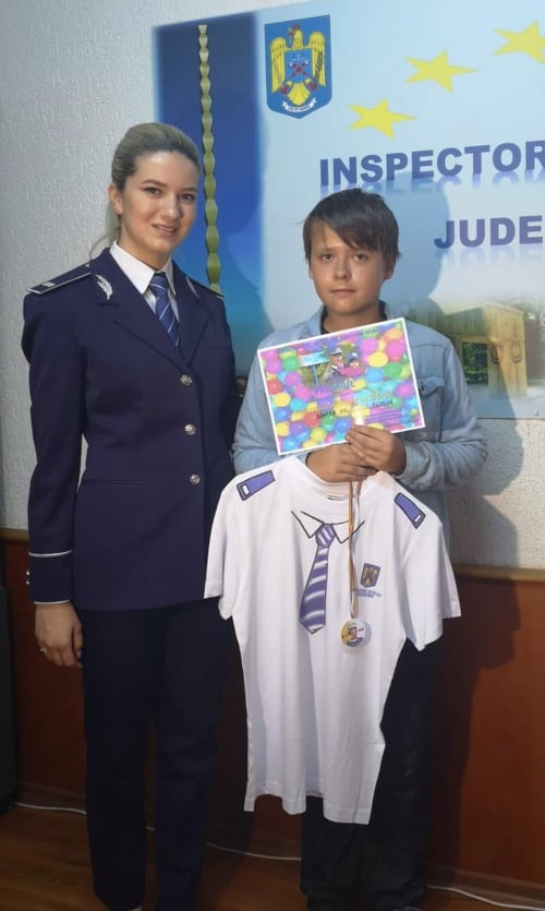 ”Cu emoție, timiditate, însă multă încredere în propriile forțe, «Bubu», așa cum familia și prietenii îl alintă, a demonstrat din plin că merită să fie câștigătorul acestui concurs. Prezentându-se la sediul instituției noastre, elevul ne-a pregătit încă o surpriză frumoasă: versuri de mulțumire pentru oportunitatea obținută. Bubu a vizitat sediul instituției împreună cu mama sa, fiind extrem de încântat că a putut să fie «polițist pentru o zi», având prilejul de cunoaște mijloacele de criminalistică, pe care polițiștii le folosesc pentru probarea activității infracționale. De asemenea, împreună cu un echipaj al poliției rutiere, polițistul junior a participat la o patrulare pe raza municipiului Târgu-Jiu, a văzut cum funcționează aparatul radar, sirenele și semnalele luminoase. Din partea noastră, Bubu a primit toată aprecierea, alături de o diplomă, tricoul special creat pentru el, precum și o experiență pe care sperăm să nu o uite prea curând”, se precizează într-un comunicat al IPJ Gorj.