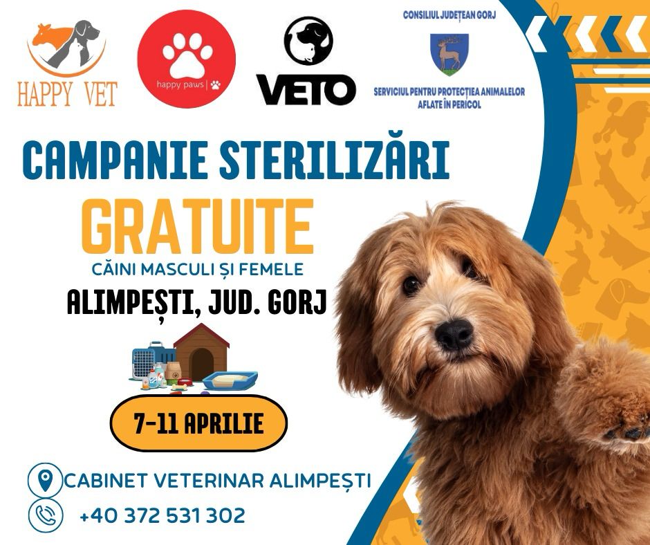 În perioada 7-11 aprilie, la Cabinetul Veterinar Alimpești, Gorj, va avea loc o campanie de sterilizări gratuite pentru câini, atât masculi, cât și femele. Această inițiativă are scopul de a reduce numărul animalelor fără stăpân și de a contribui la sănătatea și siguranța comunității.
