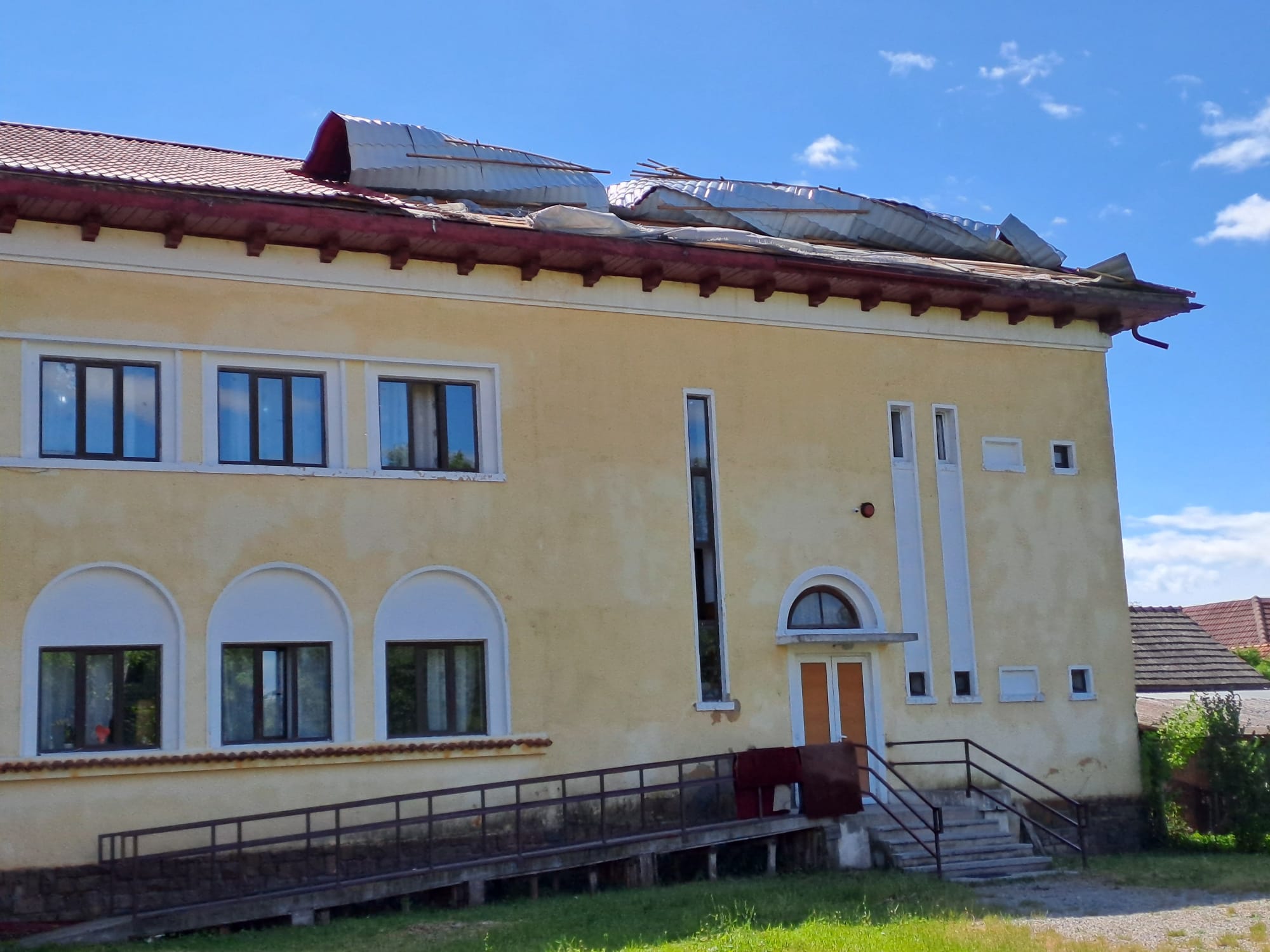 Vântul care a suflat cu peste 90 de kilometri la ora a rulat pur și simplu tabla de pe unitatea de învățământ. Autoritățile locale caută soluții pentru a face o reparație provizorie, pănă când toată tabla afectată va fi înlocuită de către un constructor.