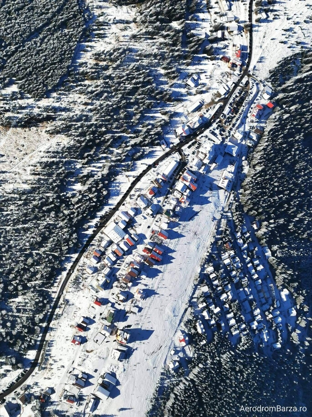 Un avion de mici dimensiuni a survolat stațiunea turistică și a realizat câteva fotografii cu zona acoperită de zăpadă. A nins în weekendul trecut, iar stratul de zăpadă măsoară până la 8 centimetri.