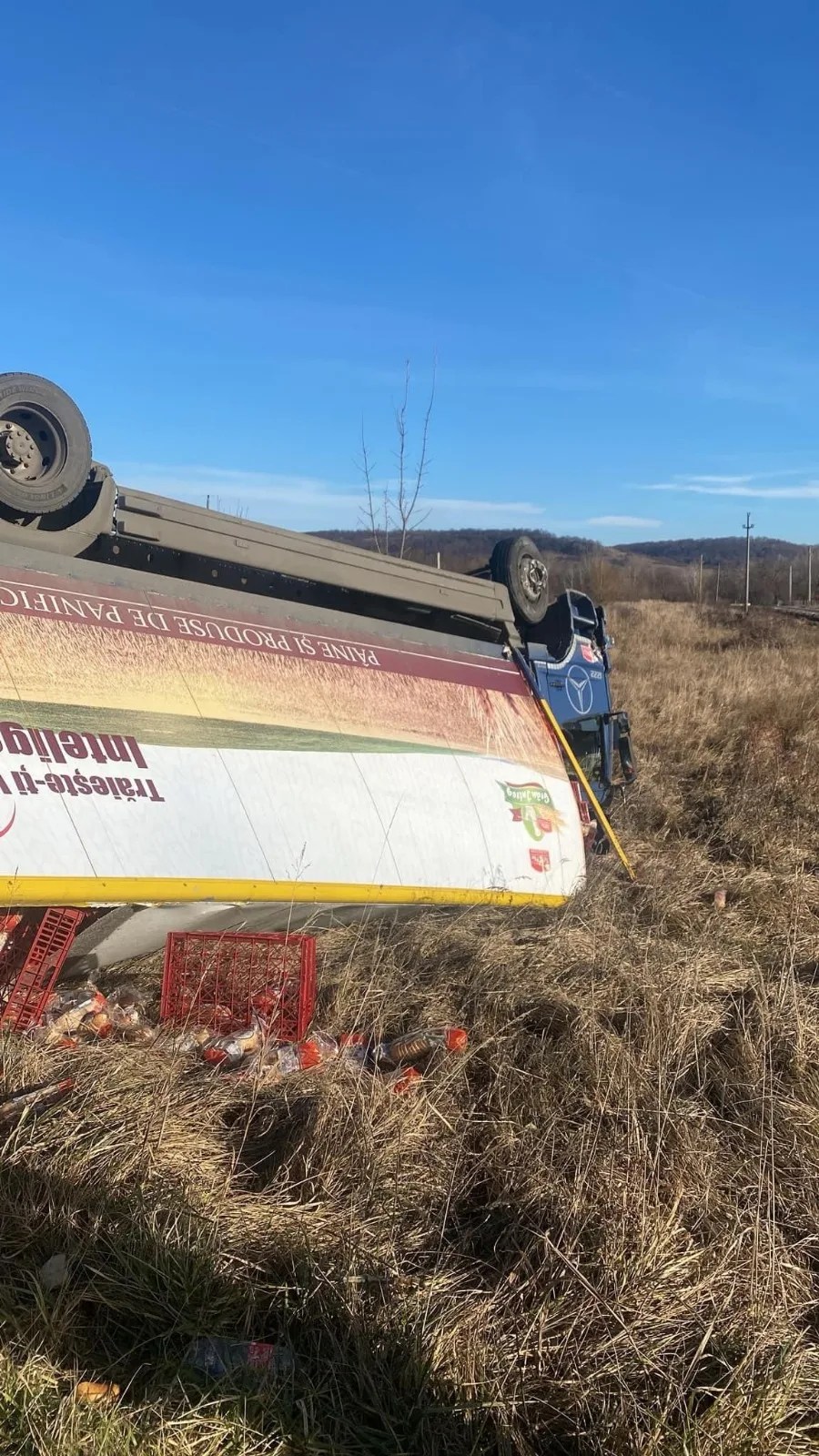 Unul dintre acestea transporta lăzi cu pâine. La un moment dat, șoferul mașinii de transport marfă a pierdut controlul volanului și s-a răsturnat cu mașina în afara carosabilului.