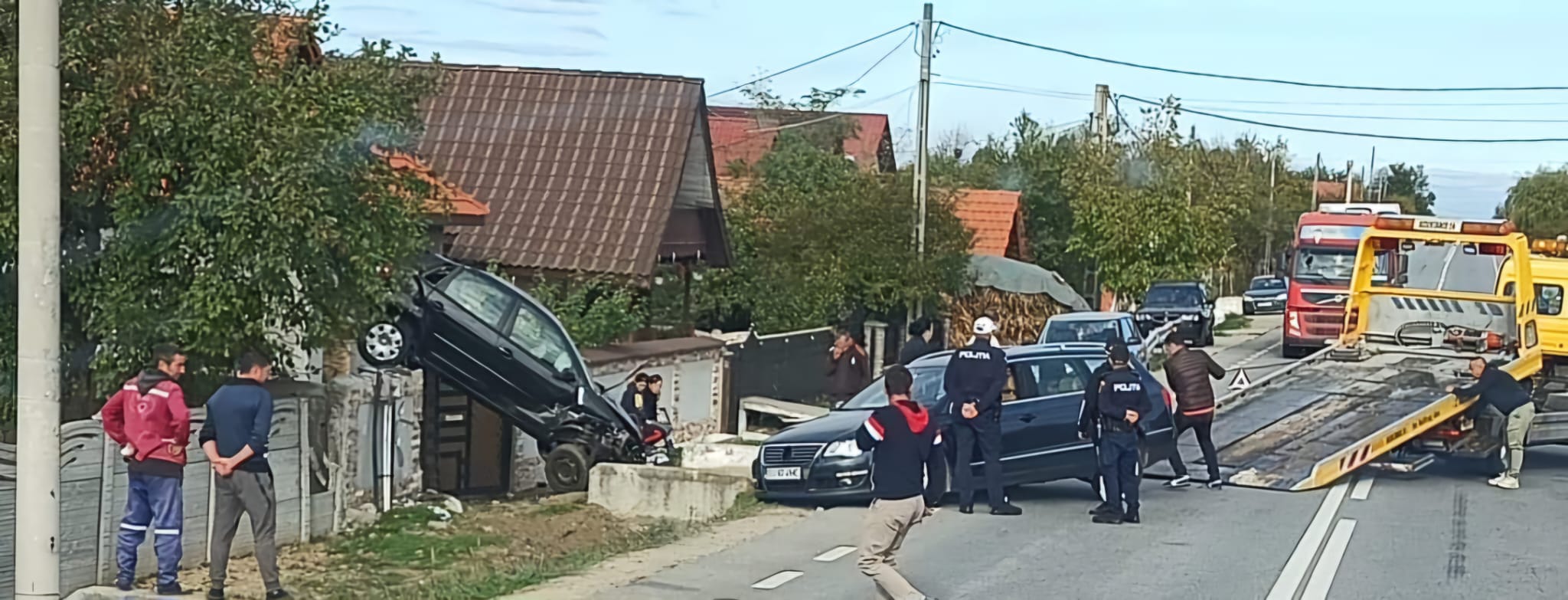 Femeia ar fi pierdut controlul volanului, a acroșat un autoturism parcat și a ajuns cu vehiculul pe porțile unei gospodării.
