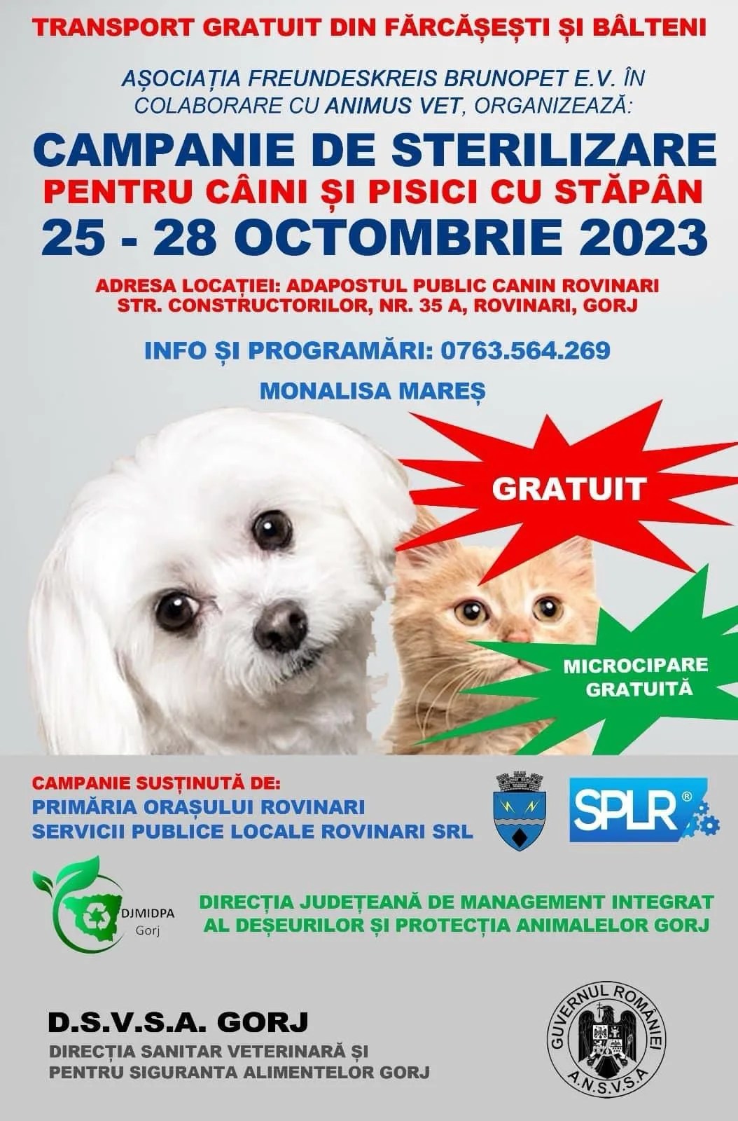 Direcția de Management Integrat al Deșeurilor și Protecția Animalelor Gorj se alătură campaniei de sterilizare, pentru câinii și pisicile cu stăpân, organizată de către Adăpostul Public Rovinari, Asociația Freundeskreis Brunopet E.V. și Animus Vet.