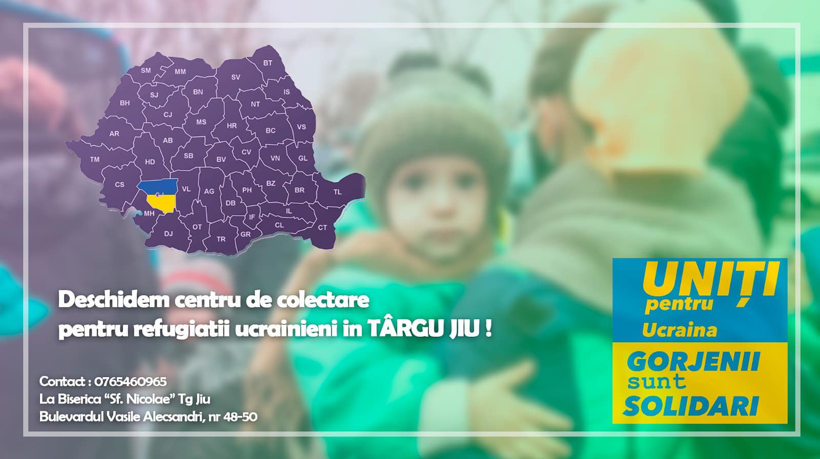 În judeţul Gorj au fost deschise mai multe centre pentru colectarea de ajutoare pentru refugiații ucraineni. Ele funcționează la Târgu-Jiu, Motru, Rovinari, Novaci şi Polovragi. De asemenea, Colegiul Național Tudor Vladimirescu din Târgu-Jiu a lansat campania umanitară „Solidari cu Ucraina”. Toți cei care doresc să ajute pot duce la biblioteca colegiului prosoape, pături, pilote, perne, lenjerii de pat, căciuli, șosete (noi sau foarte puțin folosite), măști de unică…