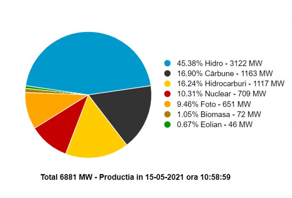 România avea sâmbătă la ora 11.00 o producție de circa 6905 MW de energie, care acoperea tot consumul intern, circa 300 de MW ajungând la export. Acum o săptămână, la un consum intern mai mic, România importa circa o mie de MW.