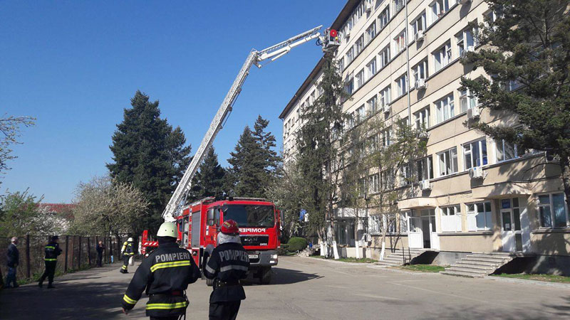 Un corp de iluminat dintr-o baie degaja fum dens. Până la sosirea pompierilor, angajații spitalului au deconectat de la energia electrică corpul de iluminat şi acţionaseră cu un stingător.