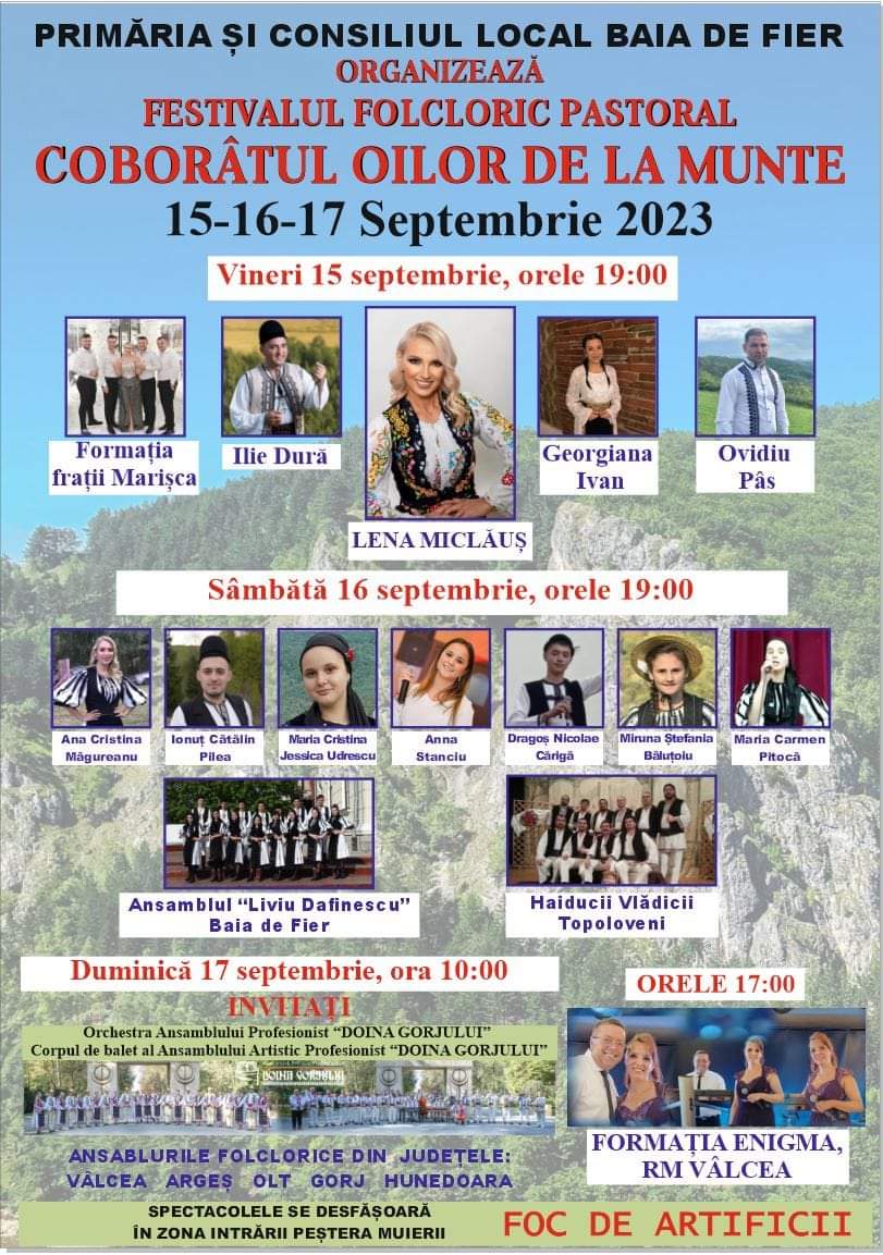 În comuna gorjeană Baia de Fier are loc, de vineri, Festivalul folcloric pastoral „Coborâtul oilor de la munte”. Participă ansambluri din județele cinci județe: Vâlcea, Argeș, Gorj, Olt și Hunedoara.