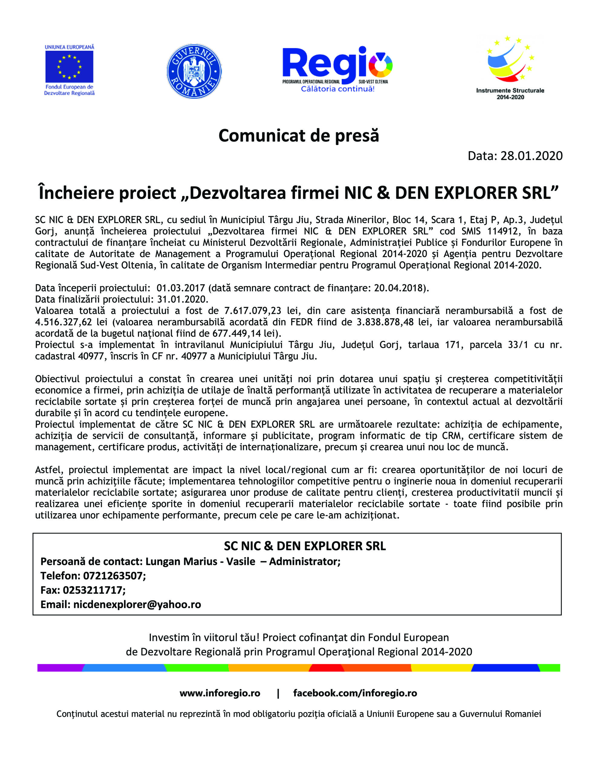 SC NIC & DEN EXPLORER SRL, cu sediul în Municipiul Târgu Jiu, Strada Minerilor, Bloc 14, Scara 1, Etaj P, Ap.3, Județul Gorj, anunţă încheierea proiectului „Dezvoltarea firmei NIC & DEN EXPLORER SRL” cod SMIS 114912, în baza contractului de finanţare încheiat cu Ministerul Dezvoltării Regionale, Administrației Publice și Fondurilor Europene în calitate de Autoritate de Management a Programului Operațional Regional 2014-2020 şi Agenția pentru Dezvoltare Regională…