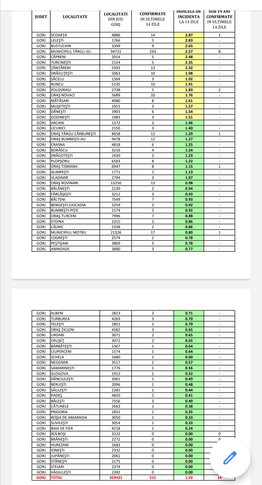 Incidența cazurilor de COVID-19 din Gorj, pe localități