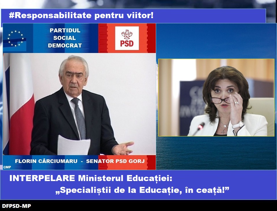 Ministrul Educației Monica Cristina Anisie, interpelat de senatorul Florin Cârciumaru. Parlamentarul de Gorj critică haosul din domeniul învățământului afirmând că oficialii ar trebui să elimine ceața în care se află sistemul educațional. Programele naționale cu finanțare, bursele și alocațiile sunt în pericol din cauza