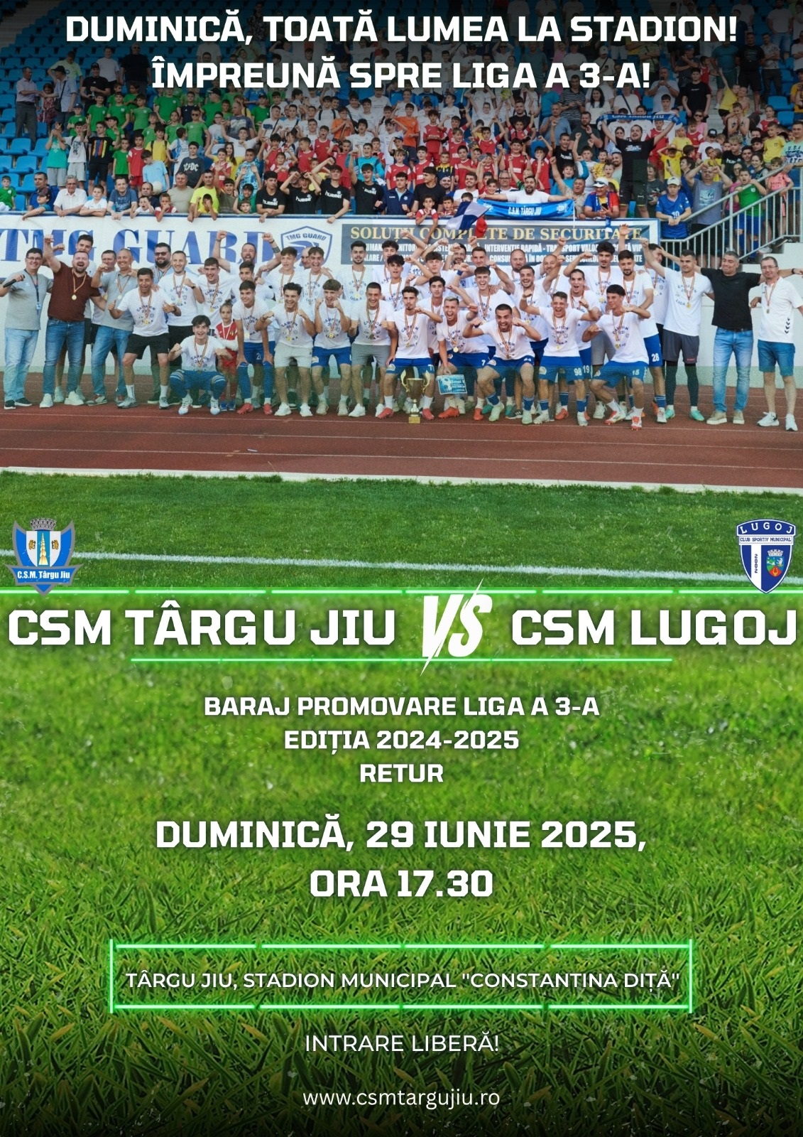 CSM Târgu Jiu se pregătește pentru cel mai important meci al sezonului, returul din barajul de promovare în Liga a 3-a, cu CSM Lugoj. Duminică, 29 iunie, de la ora 17:30, pe Municipal, CSM Târgu Jiu se va confrunta cu CSM Lugoj. În tur a fost 0-0. Fotbaliștii lui Mario Găman mizează pe sprijinul suporterilor gorjeni. Intrarea la meci este liberă.