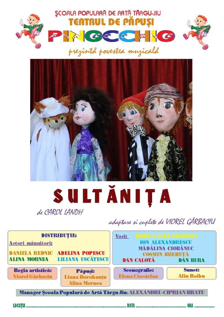 Trupa de păpușari ”Pinocchio” invită copiii, părinții și bunicii la o nouă piesa de teatru. Pentru miercurea aceasta, 02 septembrie 2020, ora 10:30, a fost aleasă piesa ”Sultănița”, în cadrul căreia cei mici vor descoperi povestea printesei Sultănița. Intrarea este liberă! Dacă vremea va fi nefavorabilă, spectacolul va fi amânat și reprogramat ulterior.