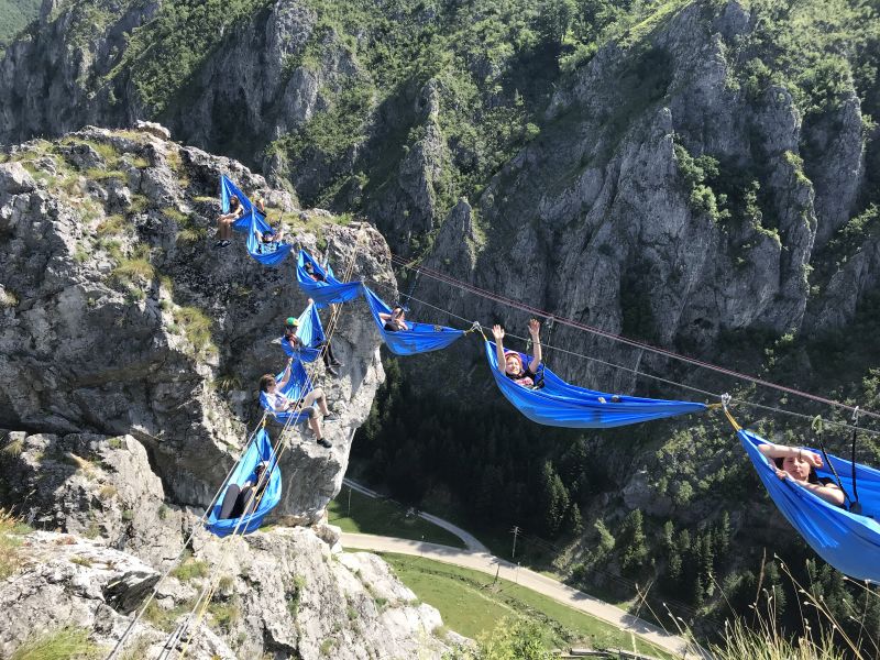 Zeci de tineri au venit în week-end la Baia de Fier, dar nu pentru a vizita Peștera Muierilor, ci pentru a urca stâncile de deasupra și a ajunge la hamacele suspendate la 200 de metri deasupra șoselei din apropiere. Hamacele sunt considerate „de senzație” pentru că oferă ocazia rară pentru oricine de a sta suspendat în aer în condiții de deplină siguranță. Chiar și cei cu rău de înălțime își depășesc orice temere și până la urmă încearcă o astfel de experiență, la finalul căreia se declară mai mult decât încântați de clipele de care au avut parte. Ca să ajungă în vârful stâncilor turiștii trebuie să străbată unul din cele zece trasee de via Ferrata, un fel de poteci amenajate cu cabluri pentru ancorarea turistului astfel încât deplasarea să se facă în condiții de siguranță maximă. Asta le dă încredere în forțele proprii chiar și celor mai stresați că ar putea păți „ceva”. „Din București vin și am stat mult să mă gândesc până să urc la hamace. Am rău de înălțime și nu credeam în viața mea că ajung așa de sus. De fapt, când am gândit excursia asta pentru așa ceva am optat, dar nu credeam că pot să depășesc o asemenea barieră. Este greu la nivel psihologic, dar cu încredere în oamenii de aici treci peste orice obstacol. Ghizii sunt extraordinari și nu pot decât să mă bucur că m-au ajutat să ajung în hamac și să stau acolo cred că vreun sfert de oră, dacă nu și mai bine. E ceva minunat”, a spus Andra.Prieteni ai acesteia fără rău de înălțime de abia au așteptat să ajungă în vârful stâncilor pentru a urca în hamace. Cu echipamente speciale aceștia au ajuns la ceea ce putea părea irealizabil în urmă cu câțiva ani. „Am fost în Muntenegru și m-am dat cu parașuta. Acolo mi-am depășit teama de înălțime. Merită 200% să vii aici. Am făcut și tiroliană, deci am experiență în a lucra pe cabluri la înălțime și de asta și spun că experiența de aici e una foarte faină. Acum o să mergem undeva în munți sau poate spre Cheile Oltețului, încă nu ne-am decis, ca să prindem apusul, iar de luni revenim la muncă”, a spus un alt turist. „E ceva foarte fain. E de neuitat, aș reveni oricând cu drag. Am văzut pozele și mi-am dat seama că e palpitant. Totul e fain și e sigur, adică nu ești în pericol, deși poate părea. Mă bucur nespus că am ajuns aici”, a menționat și Tudor, din Timișoara. Pentru toți ghid la hamacele suspendate a fost Gabriel Chiriac, cel care a și amenajat tabăra respectivă, dar și traseele de via Ferrata din apropierea peșterii. „Pasul psihologic este cel mai greu care trebuie făcut. Fizic fiecare dintre noi corespunde pentru a parcurge acest traseu și pentru a sta în hamace la altitudine. Pragul psihologic ține însă de noi, de ceea ce am reușit să asimilăm în experiențele noastre de viață, de puterea de autocontrol. Totul e pentru a ajunge la final acasă cu oameni fericiți că au avut o experiență unică la hamace. Am avut situații cu oameni care aveau rău de înălțime, dar care, pe parcurs, prin autocontrol și autosugestie au reușit să își învingă acest rău. Ne-am auzit apoi după câteva luni și spuneau că sunt fericiți că nu mai au acest trac la altitudine”, a precizat Dan Chiriac.