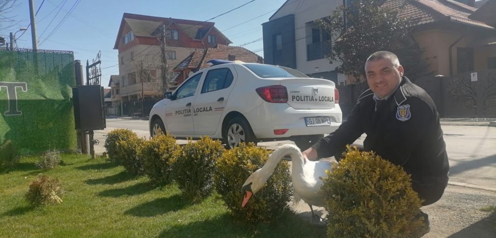 O lebădă ranită a fost găsită, sâmbătă, 12 martie, de o familie din municipiul Târgu Jiu, care a dus-o la Poliţia Locală.