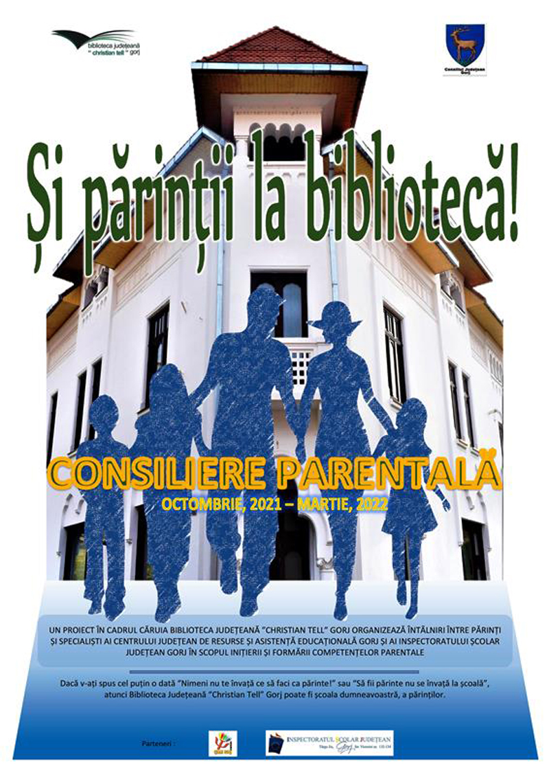 Începând din această lună, la Biblioteca Județeană ,,Christian Tell” Gorj se va desfășura o nouă ediție a proiectului ,,Și părinții la bibliotecă!”, proiect în cadrul căruia, pe parcursul mai multor întâlniri lunare, participanții vor avea ocazia să deslușească o parte din tainele parentingului cu ajutorul specialiștilor din diverse domenii.